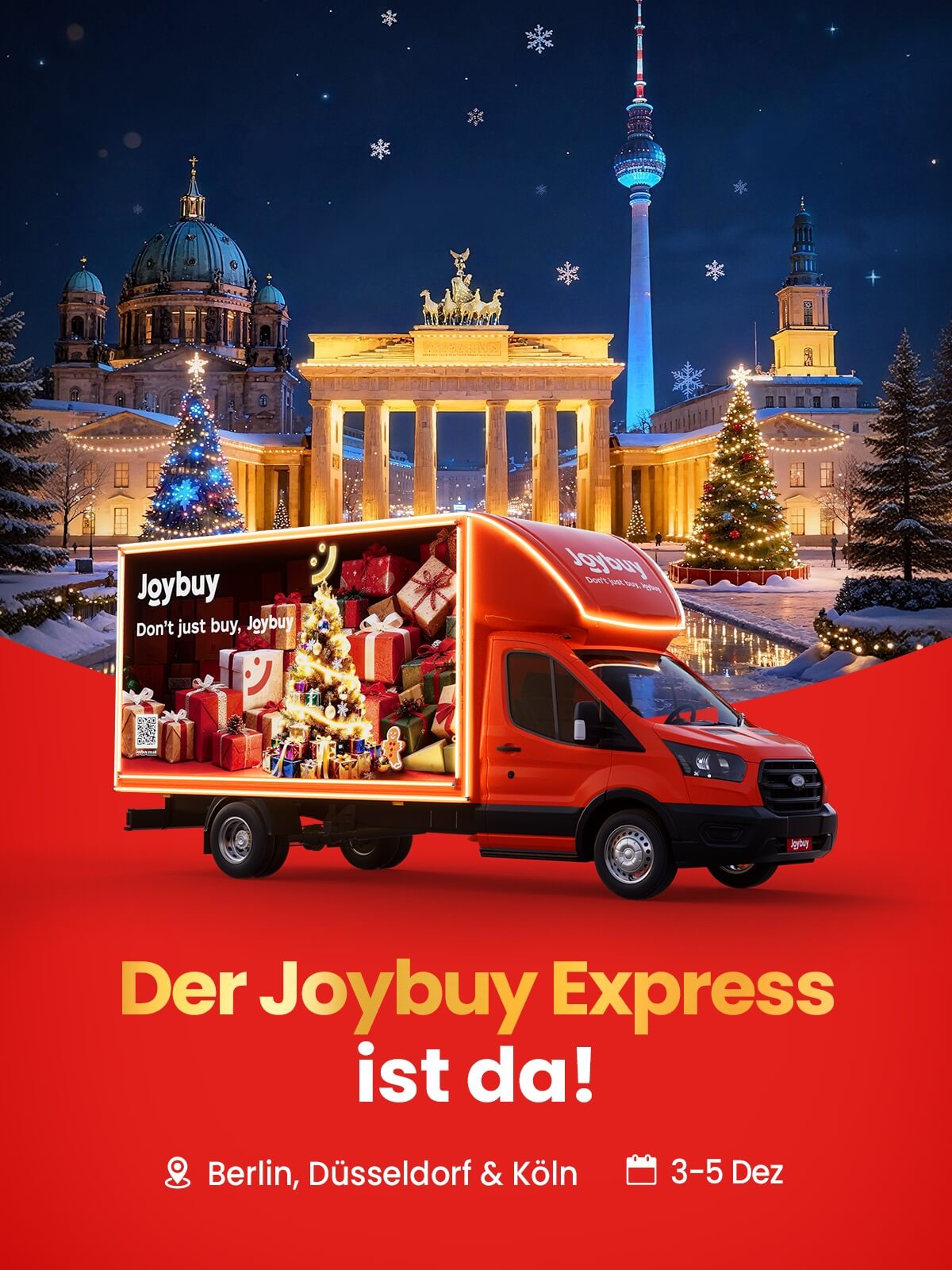Vom 3. bis 6. Dezember macht der Joybuy Express Halt in Berlin, Köln und Düsseldorf – unter anderem am Brandenburger Tor, Gendarmenmarkt, Alexanderplatz und Potsdamer Platz in Berlin sowie an der Schildergasse in Köln und der Königsallee und dem Carlsplatz in Düsseldorf.